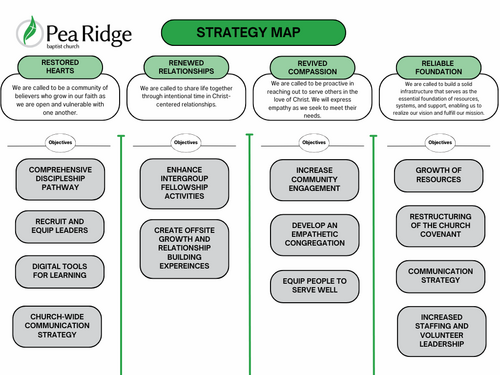 The Renew Leadership Team has been meeting for fourteen months in consultation with Dr. Ed Rogers of Renew Transformational Strategies. A strategy map is in place, with subgroups working on each objective to develop initiatives and identify expected key results. One of these subgroups is looking specifically at two objectives: to enhance relationship building activities and create an offsite Spiritual Retreat. The initial retreat anticipated for Fall 2026, is intended to be one of many opportunities offered to members of Pea Ridge Baptist Church. The recent Camden Park Family Fun Night was one of the results of this subgroup working towards renewed relationships, restored hearts and revived compassion by providing an opportunity for church members to interact and bond over fun activities. While waiting for formal planned activities is an option for developing relationships with other church members, there are ways you can do this right now. For instance, how many times have you gone to lunch following a church service? Consider asking someone to go with you and then discuss the sermon message and scripture verses from the reading plan in Psalms. Did you know there are free devotional books outside the church office? Take one of these booklets and give one to your friend, neighbor or co-worker. Perhaps you could then use the devotional to talk to others about the love of Jesus. Pastor Dan has been faithful to encourage us to join a small group. This is a wonderful way to get connected to other believers and to live out our renewed vision in an intentional God-honoring way. When we devote ourselves to sharing life together through intentional time in Christ-centered relationships we experience deeper connections and spiritual growth. In addition to small groups, you can serve in one of the many ministries at Pea Ridge Baptist Church. The life of the church is vibrant and ready to equip those who are not yet serving. While the church renewal process uses the time and talents of the pastor, staff and volunteer leaders, its foundational strength relies on the prayers and participation of the whole congregation. Please continue to pray for our pastor, staff and volunteers. Seek out opportunities to participate in activities if you haven’t already and challenge yourself to take that next step of faith to grow, connect and place God first in your life.